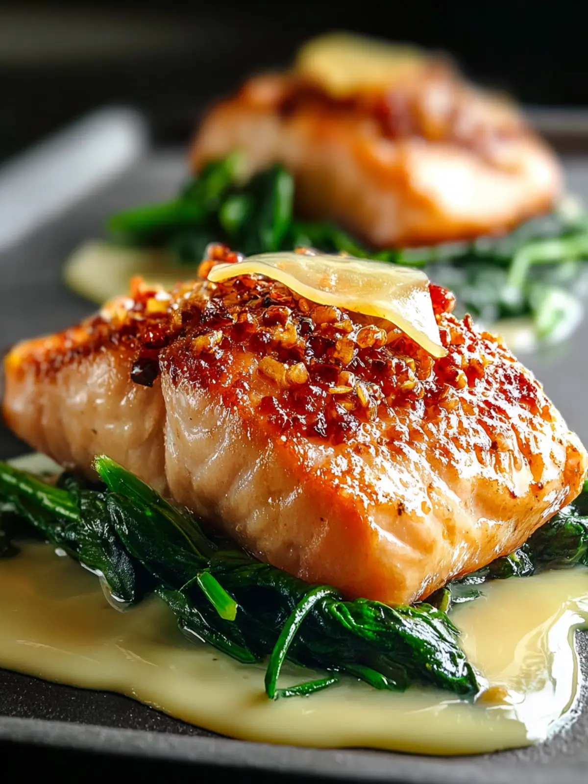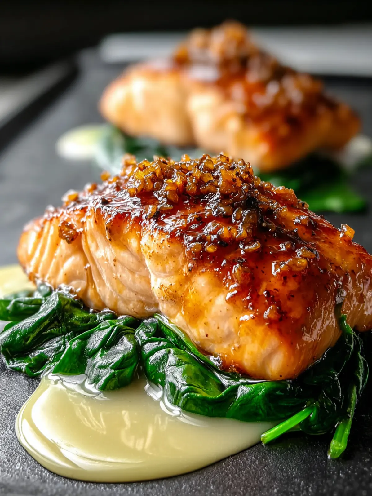 A delicious and healthy salmon dish featuring fresh spinach, garlic, and lemon.