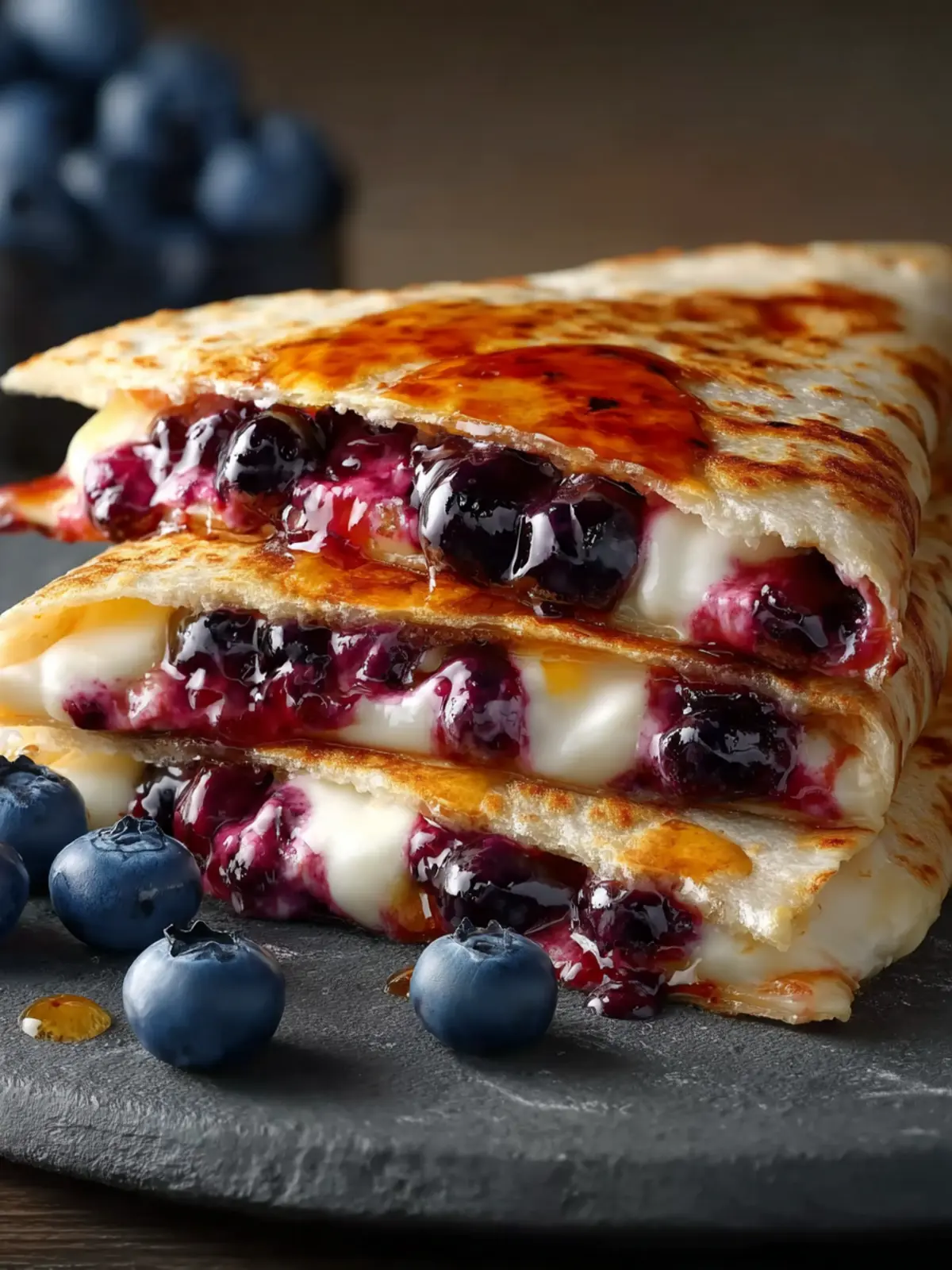 Delicious quesadilla filled with cream cheese, fresh blueberries, and a hint of honey.