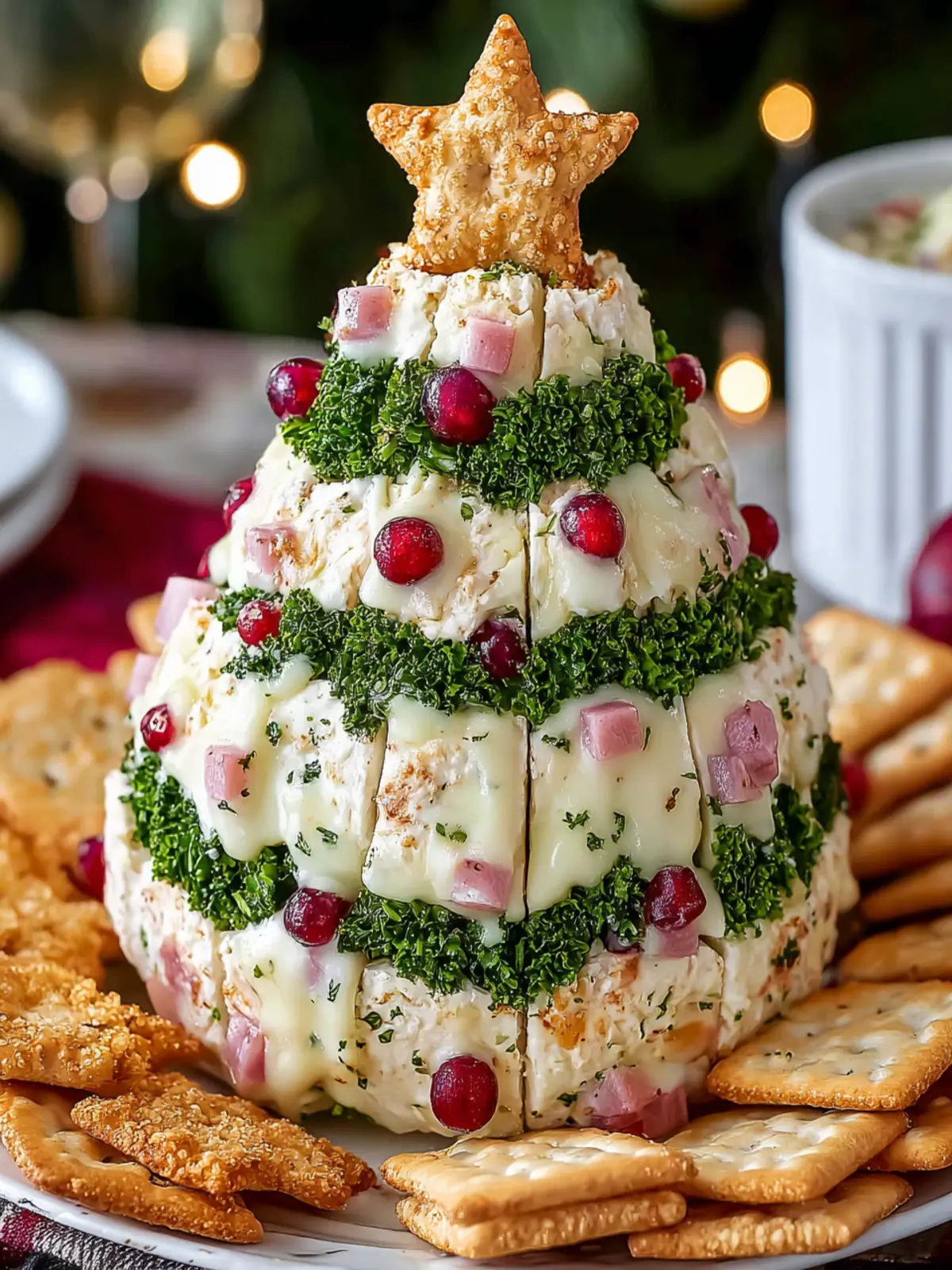 A festive cheese ball shaped like a Christmas tree, perfect for holiday gatherings.