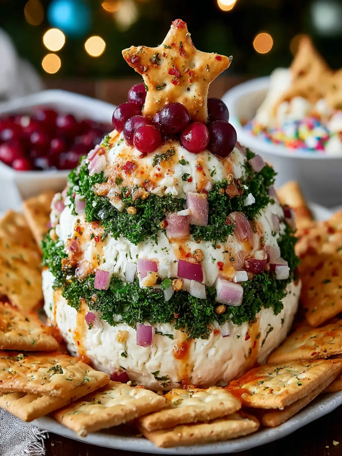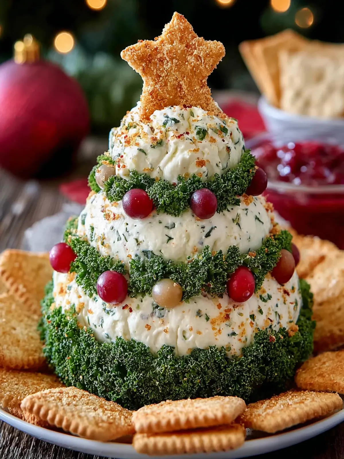 Presentation is everything with your Christmas Tree Cheese Ball. Offer an array of dippers, such as fresh vegetables, crackers, and breadsticks. Not only does this add color and texture, but it also allows guests to customize their snacking experience.