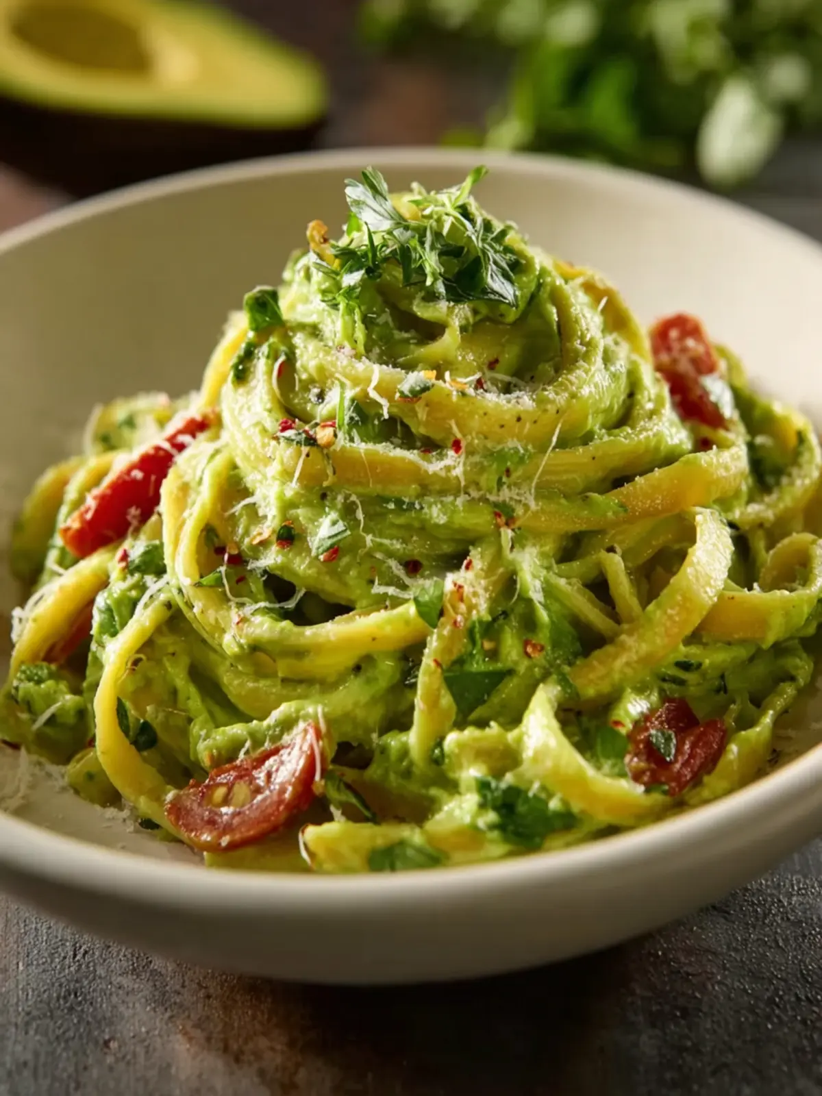 A sprinkle of toasted pine nuts or a handful of fresh herbs, such as basil or cilantro, adds a lovely texture and enhances the visual appeal of your plate. Plus, it gives that restaurant-quality finish to your creamy avocado pasta!