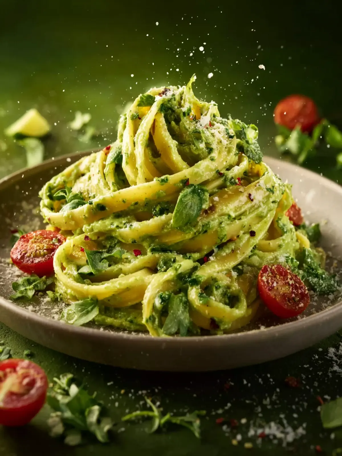 Plate the creamy avocado pasta and garnish with cherry tomatoes, a sprinkle of red chili flakes, or a dairy-free parmesan-style topping if desired.