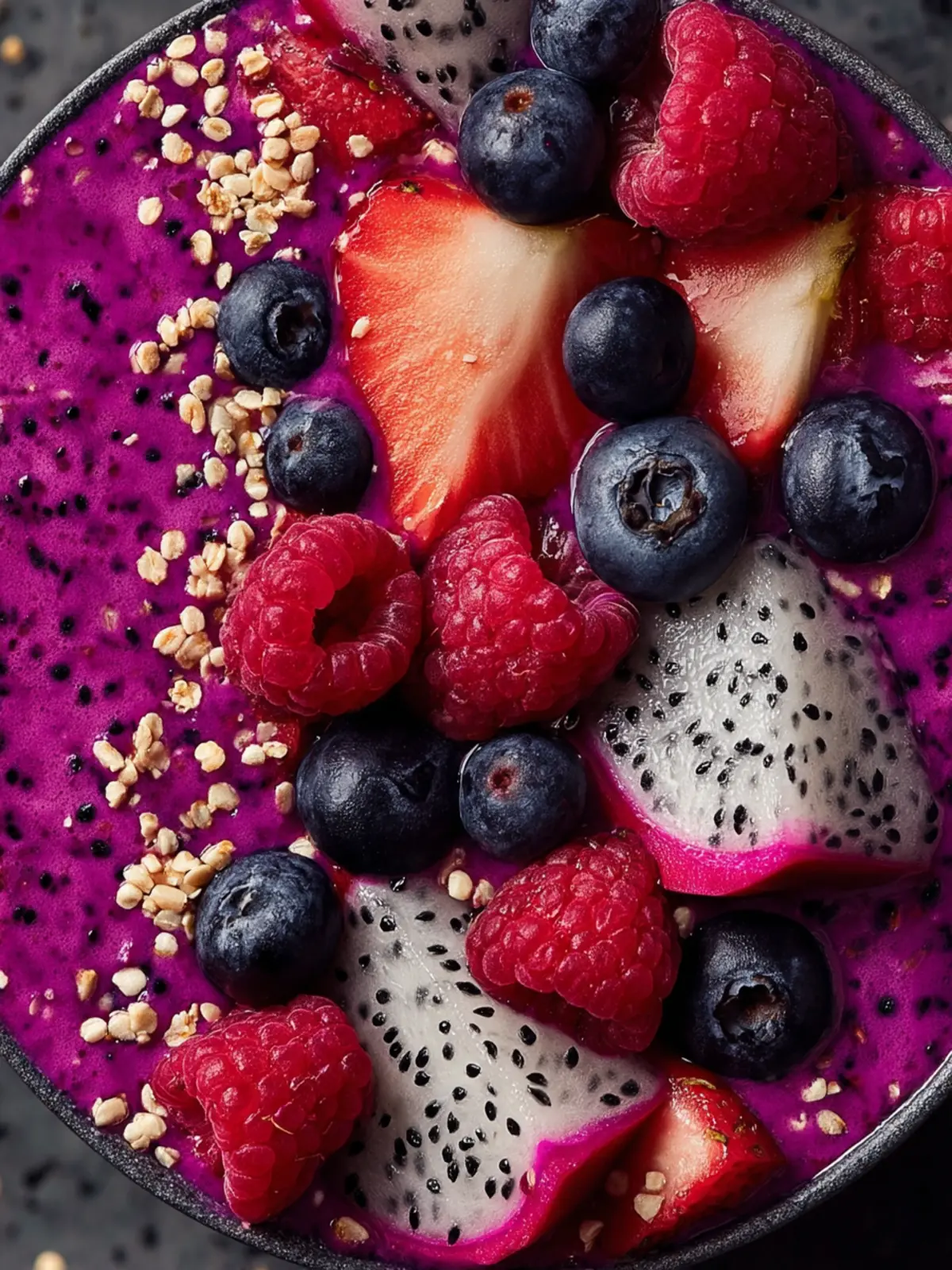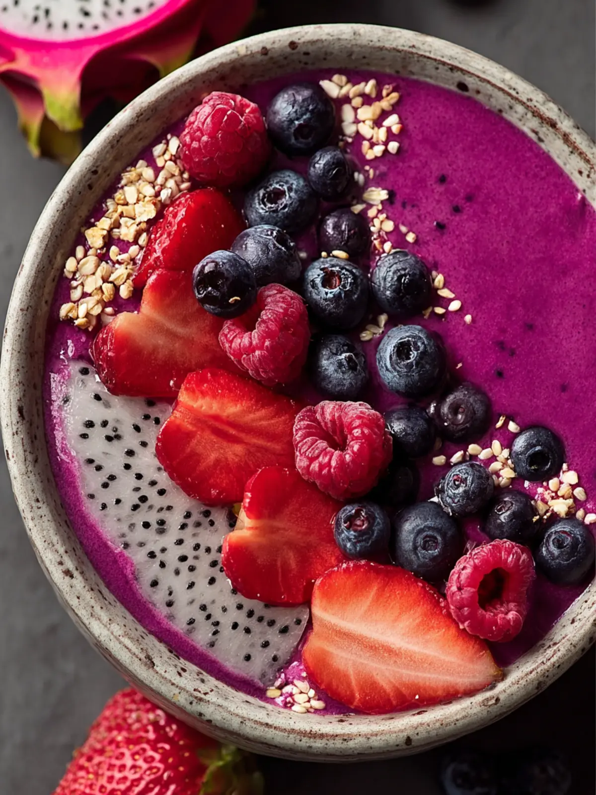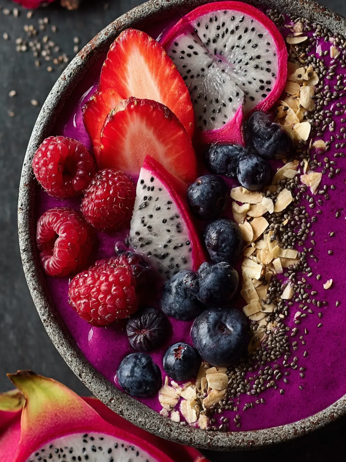 Colorful Presentation: Serve the bowl in unique dishes or glassware to highlight the striking colors. A coconut bowl or a simple white bowl allows the bright pink of the dragon fruit and deep hues of the berries to pop.