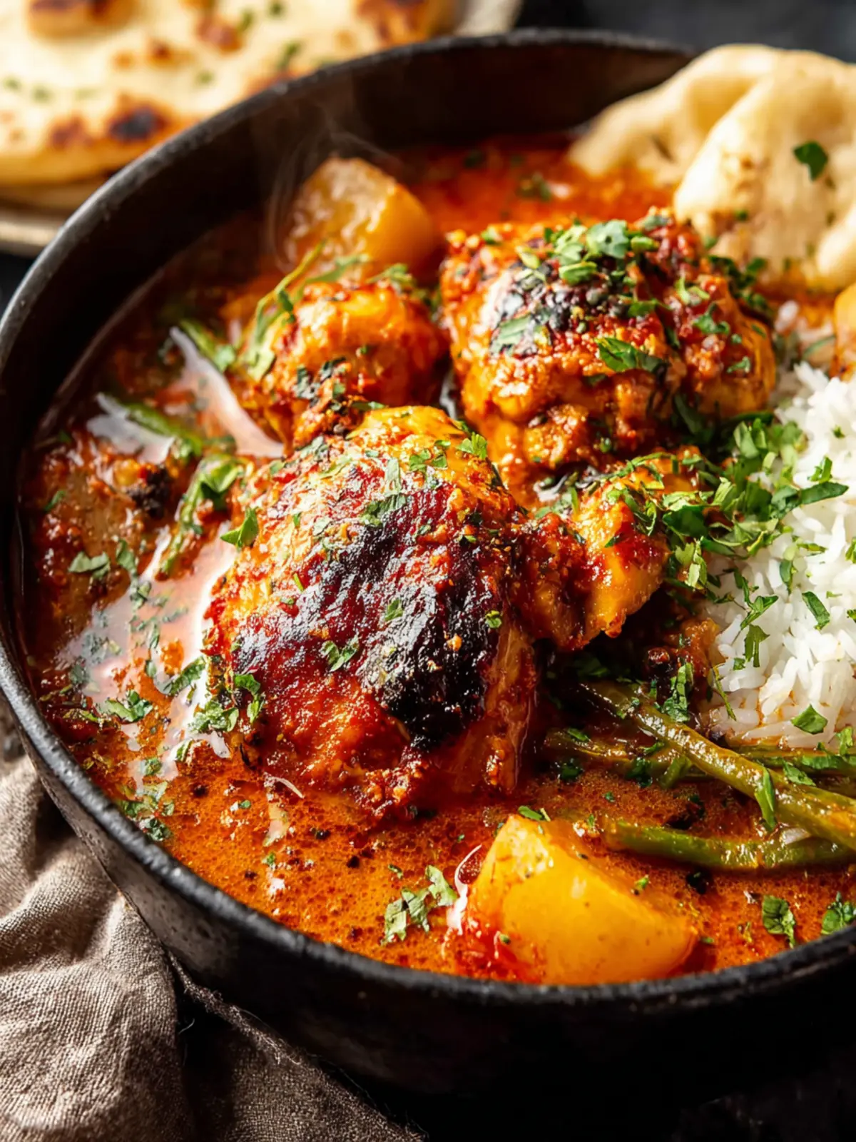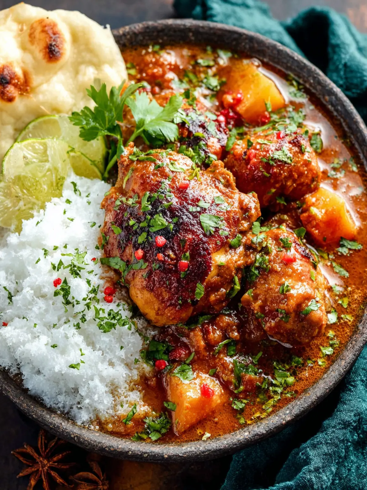 A delicious chicken curry made with aromatic spices and served with rice and naan.