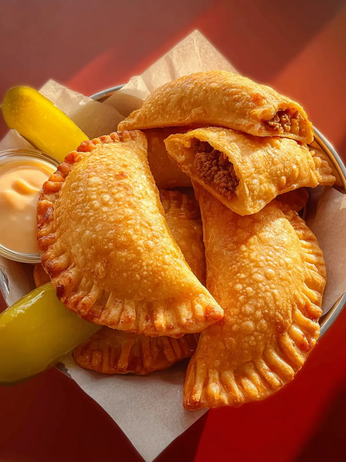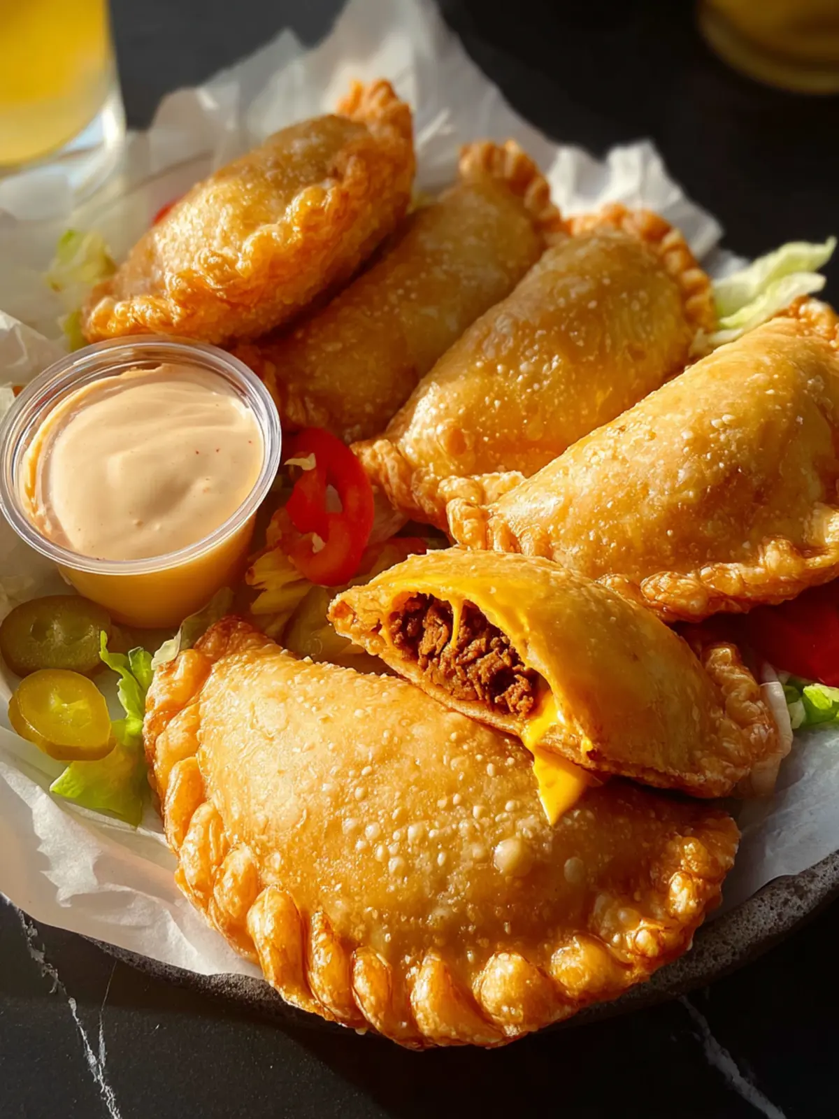 Delicious beef empanadas filled with a savory mixture topped with a homemade burger sauce.