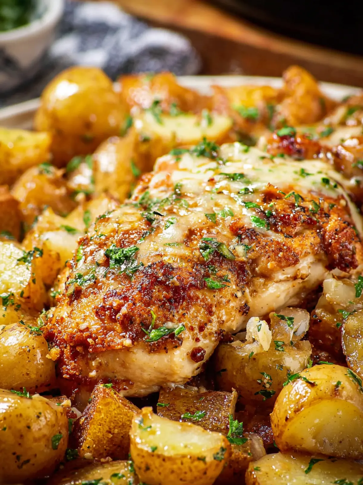 A delicious and easy recipe for garlic parmesan chicken served with baby potatoes, perfect for a weeknight dinner.