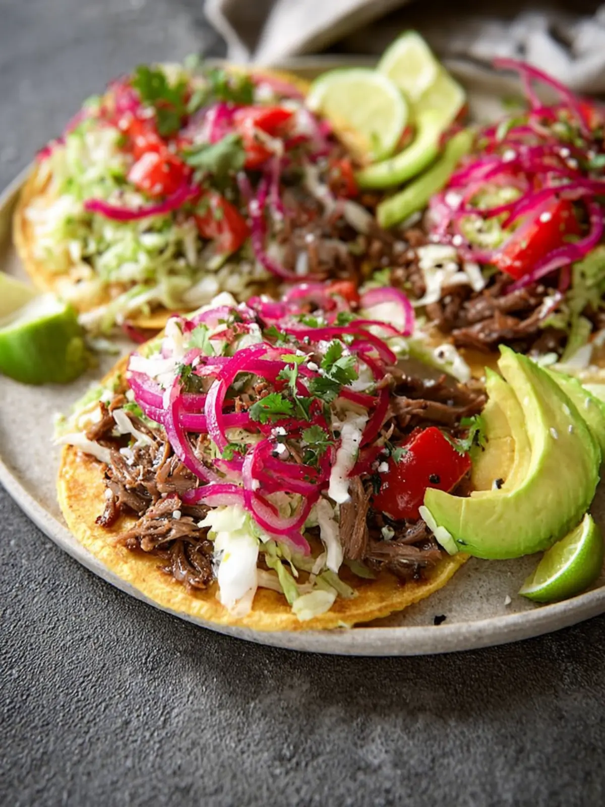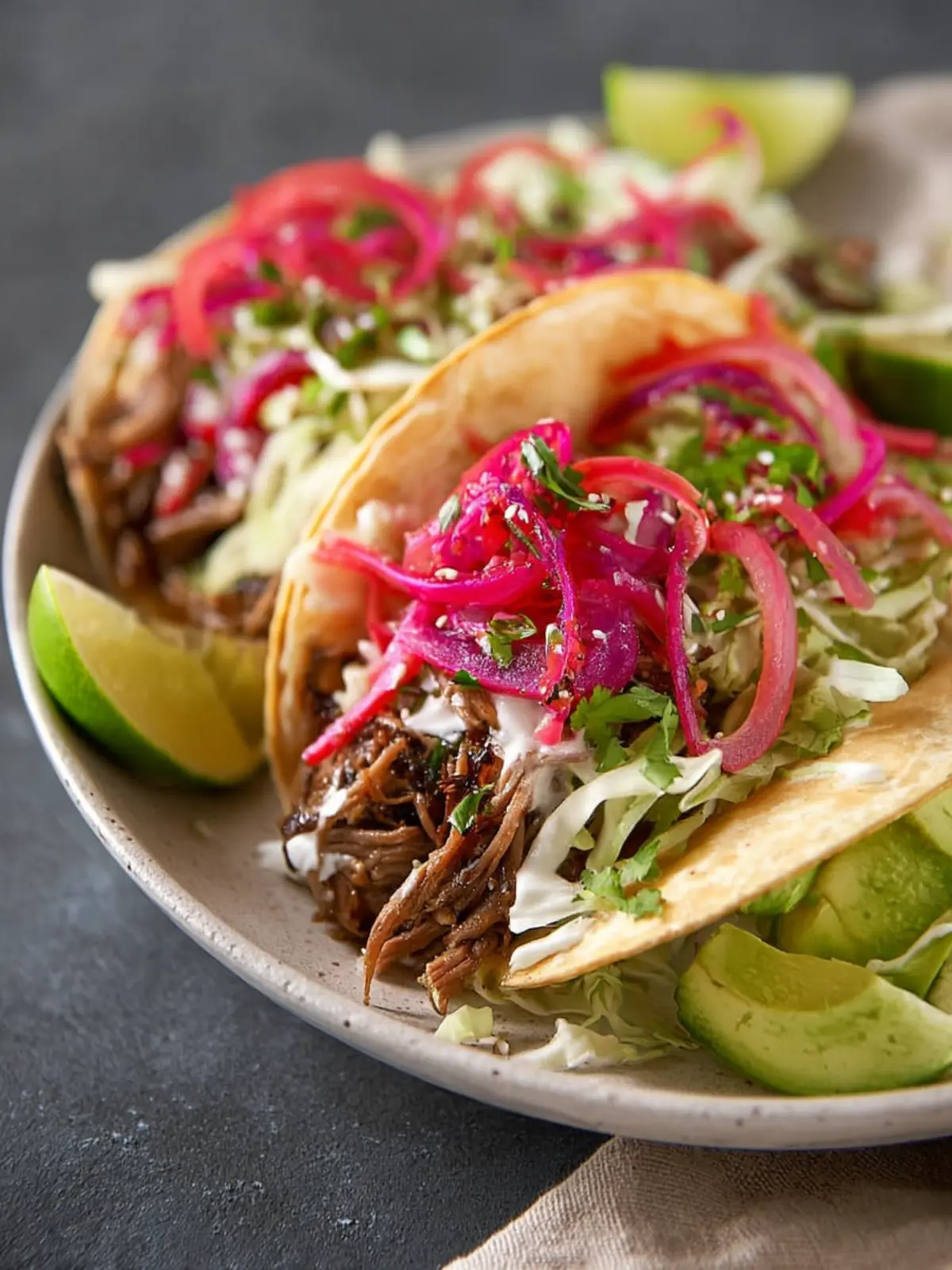 Delicious slow-cooked beef tacos, perfectly seasoned and topped with fresh vegetables.