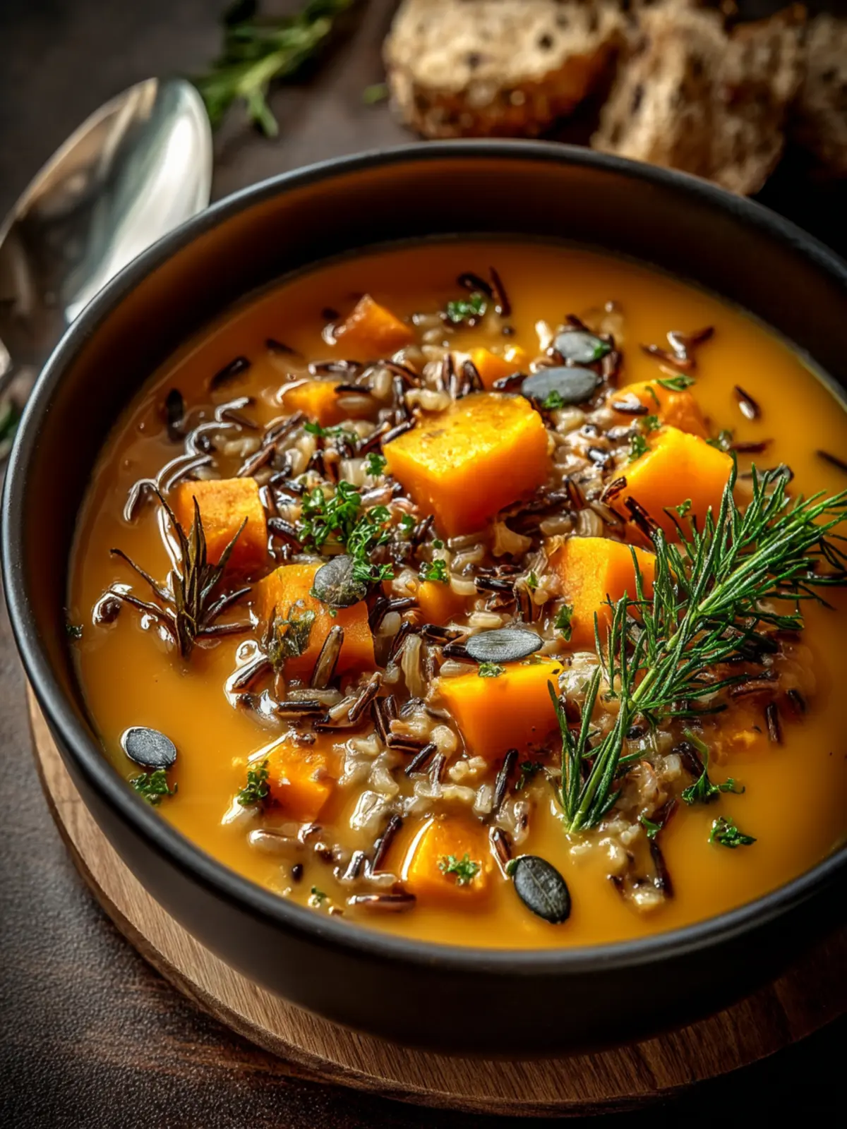 Elevate your cozy nights with Nourishing Vegan Pumpkin Wild Rice Soup by serving it in style. A simple change in presentation can turn an ordinary dinner into a delightful experience.