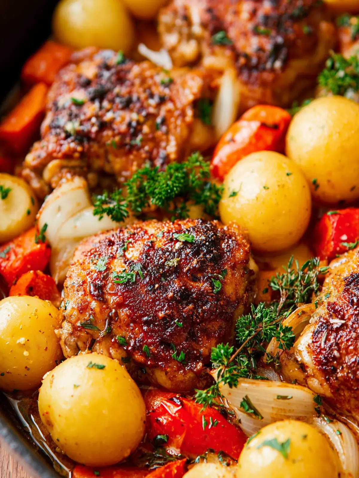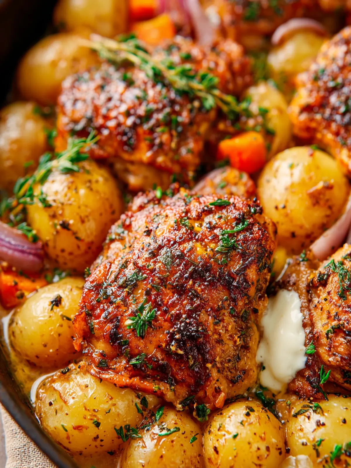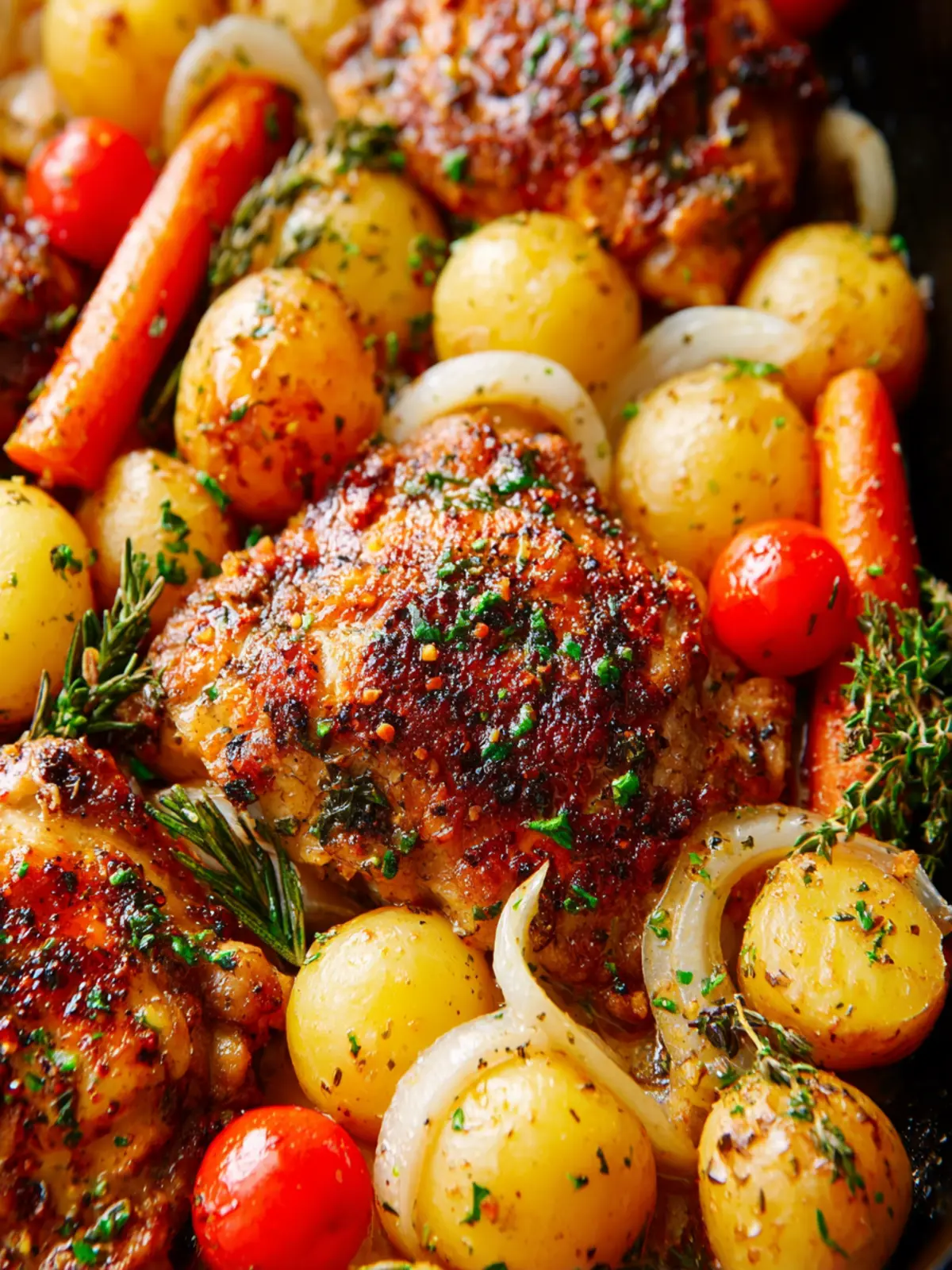 A delicious recipe for garlic herb chicken thighs baked with baby gold potatoes, onions, and carrots.